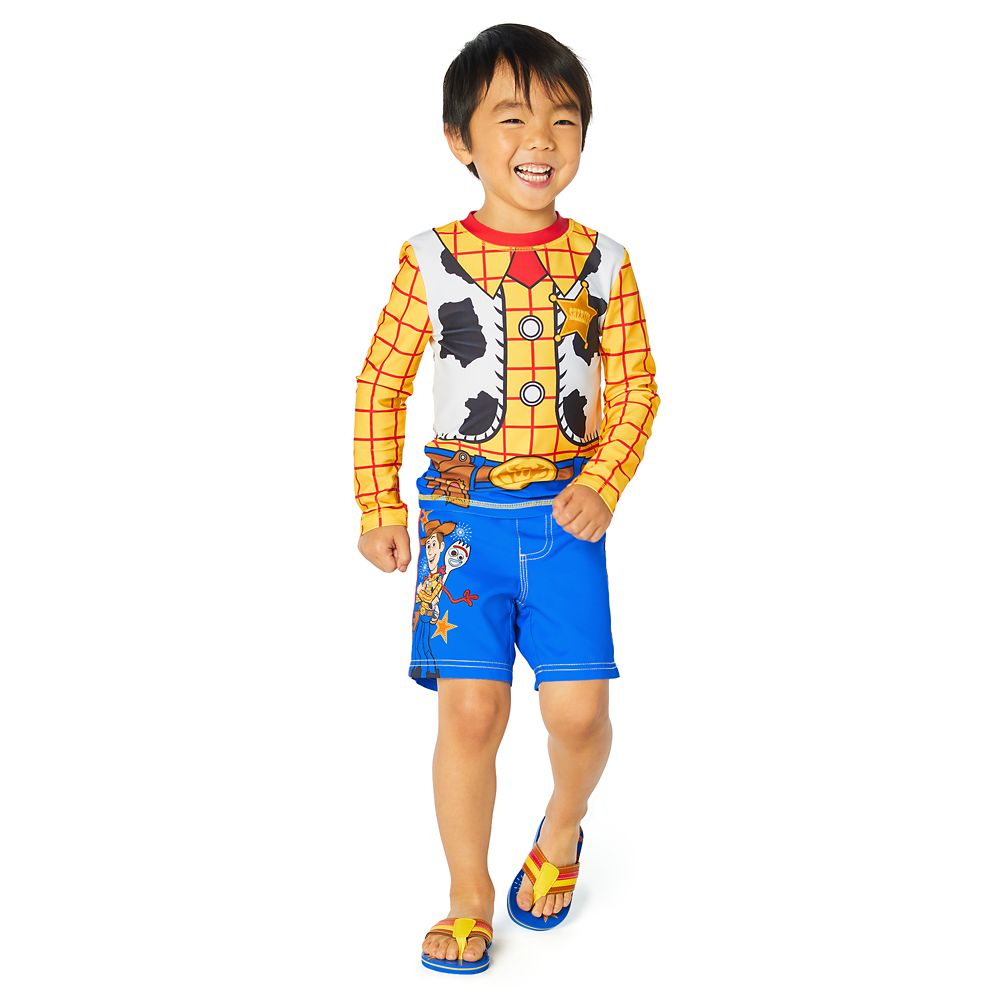 Little cowpokes can take their adventures all the way to sunset when they mosey around in this Woody rash guard. With built in UV protection and sublimated costume art, this swim shirt will keep them safe as they ride the range or splash around the shore.
