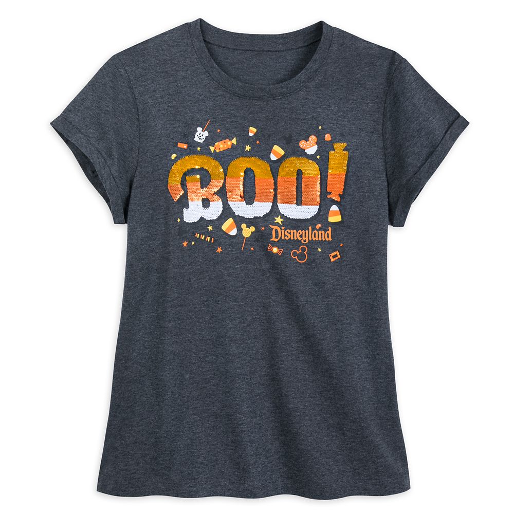 Cast a glittering spell over Halloween Tricks and Treats in this heathered jersey tee from Disneyland Resort. Brush the ”Boo!” sequins to see them flip and show different colors!