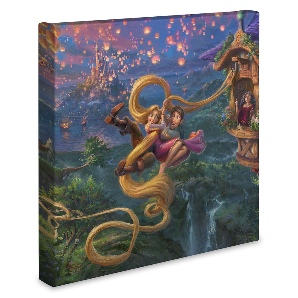 The Gallery Wrapped Canvas ”Tangled Up in Love” by Thomas Kinkade Studios features the handsome bandit Flynn Rider and Rapunzel enjoying a playful moment under the suspicious gaze of Mother Gothel.