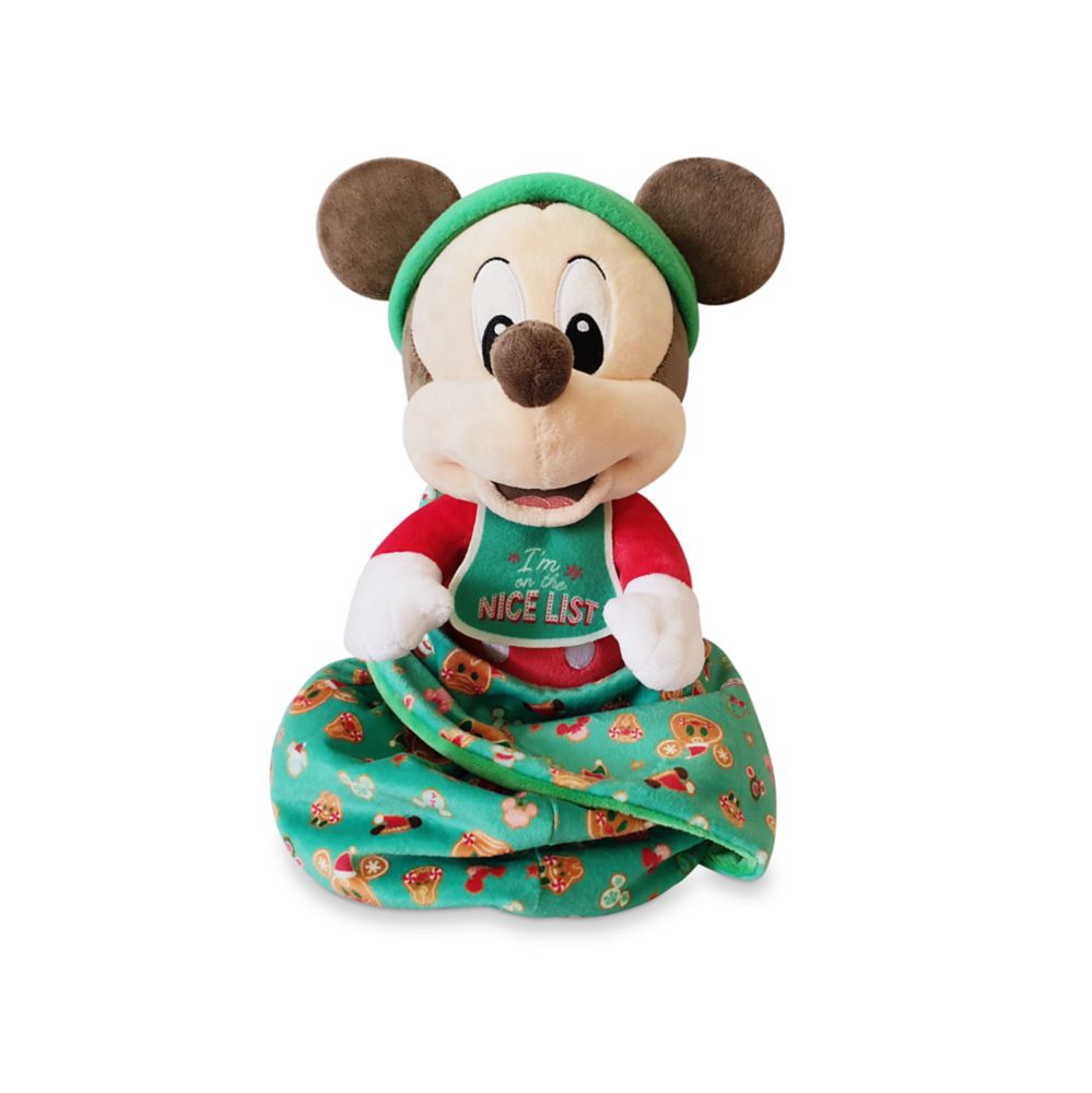 Our Disney Babies Mickey Mouse plush doll offers a season of snuggles. Baby Mickey wears adorable velour pajamas and is all wrapped-up in his soft gingerbread print pouch blanket with self-stick fabric clasp.