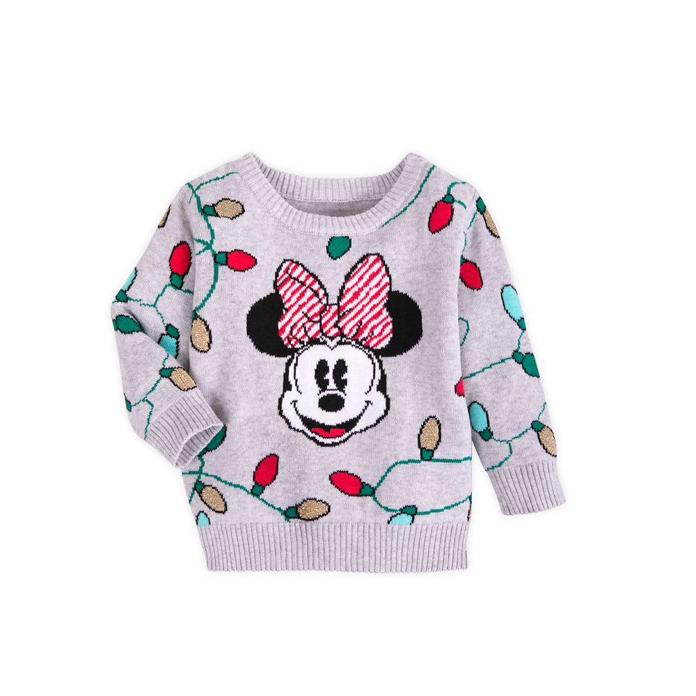 Baby will light up the holiday season with Minnie in this comfy gray sweater. With a candy-striped bow and colorful holiday lights all over the front and sleeves, this pullover has merry style to spare.