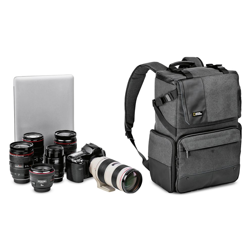 The versatile National Geographic Walkabout Camera and Laptop Backpack can accommodate a DSLR with 70-200 f/2.8 attached and up to five lenses, plus a 15” laptop. Featuring the Manfrotto Protection System, this stylish bag is designed to absorb shock and protect your gear.