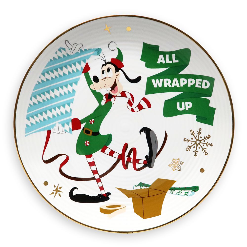 Goofy has got hims’elf so excited about packing presents on this festive dessert plate featuring an ”All wrapped up” ribbon and gold snowflake accents. This jolly scene is as sweet as the desserts you place on this ceramic dish.