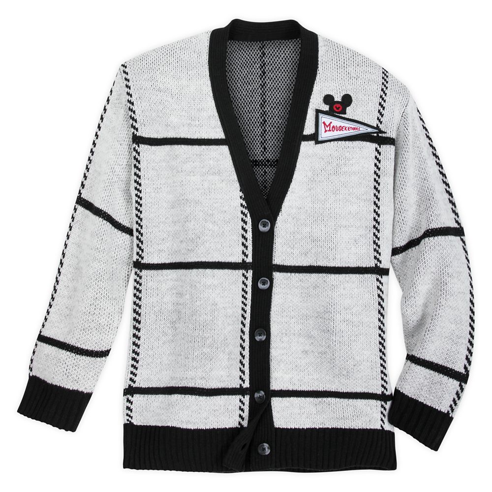 You’ll be as welcome as can be as the fashion leader of the Mickey Mouse Club with this retro-style cardigan. The geometric design features contrasting borders and trim, a smiling Mickey on the back and an embroidered Mouseketeer banner and ear hat on the front.