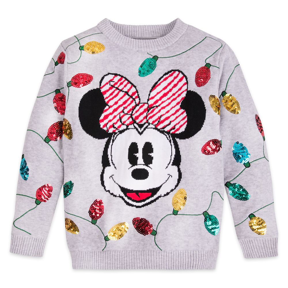 Your little one will light up the holiday season with Minnie in this comfy gray sweater. With a candy-striped bow and sparkling sequin holiday lights all over the front and sleeves, this pullover has merry style to spare.