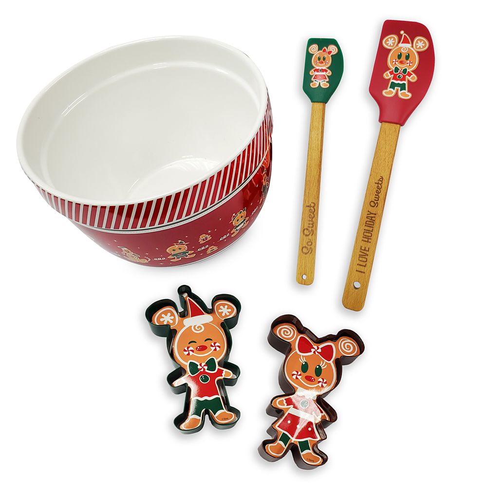 Warm hearts and your kitchen with some freshly baked holiday treats. Mickey and friends are on hand to help you mix up something sweet and festive with this set that includes a bowl, two spatulas, a Mickey cookie cutter and a Minnie cookie cutter.
