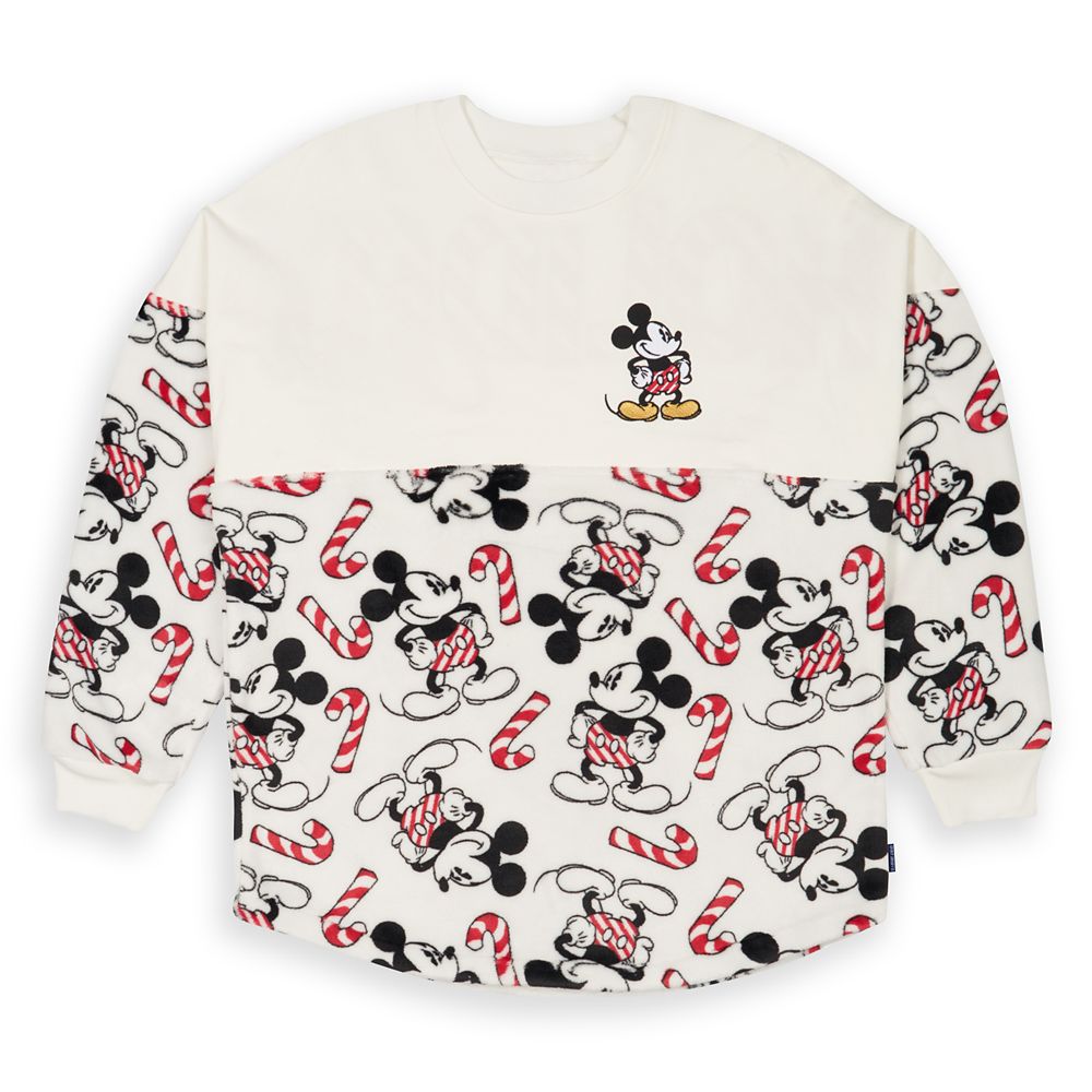 Mickey brings a large amount of ”Holiday cheer” to this fun and festive Spirit Jersey. Certain to become a warm favorite, its super soft sherpa-style fabrication features an allover print of Mickey in his candy cane-colored shorts surrounded by the Christmas candy.