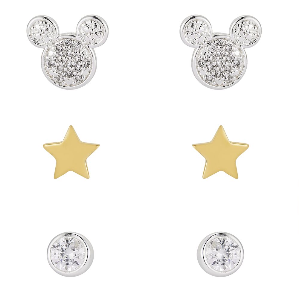 Mix and match Mickey style with this set of three different pairs of earrings. The three designs include a crystal earring pair of your favorite character Mickey Mouse icon, a pair of gold tone stars, and a pair of silvertone bezels with cubic zirconia.