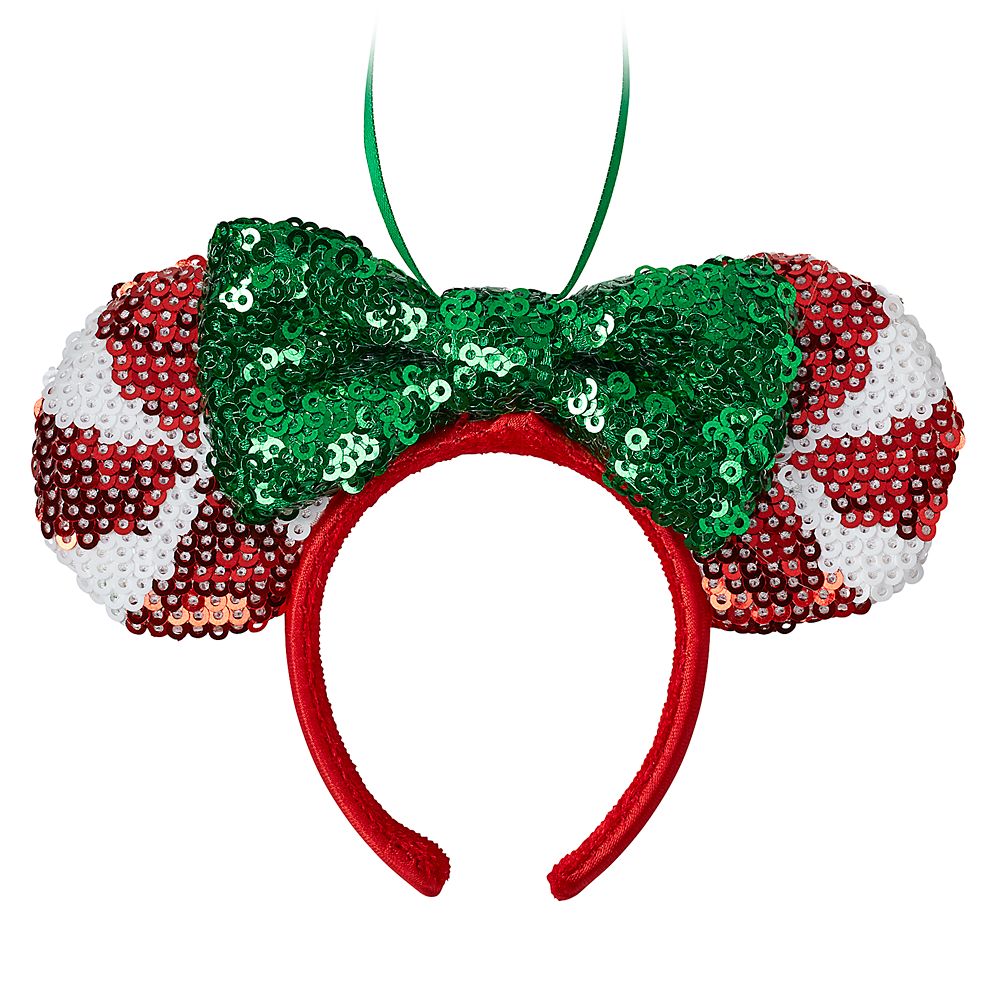 Add a novel twist to your holiday décor with this Minnie Mouse Ear Headband Ornament. The miniature version of the classic sequined design features peppermint twist ears and green bow.