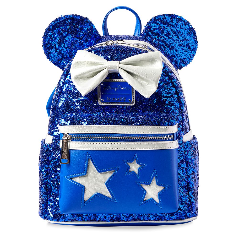 Minnie’s true blue fashion shines on this dazzling mini backpack by Loungefly. Featuring a sequined design, Minnie ears, a white star-embossed bow, plus white star cutouts, this bag’s compact silhouette makes it easy to carry your essentials around in style.
