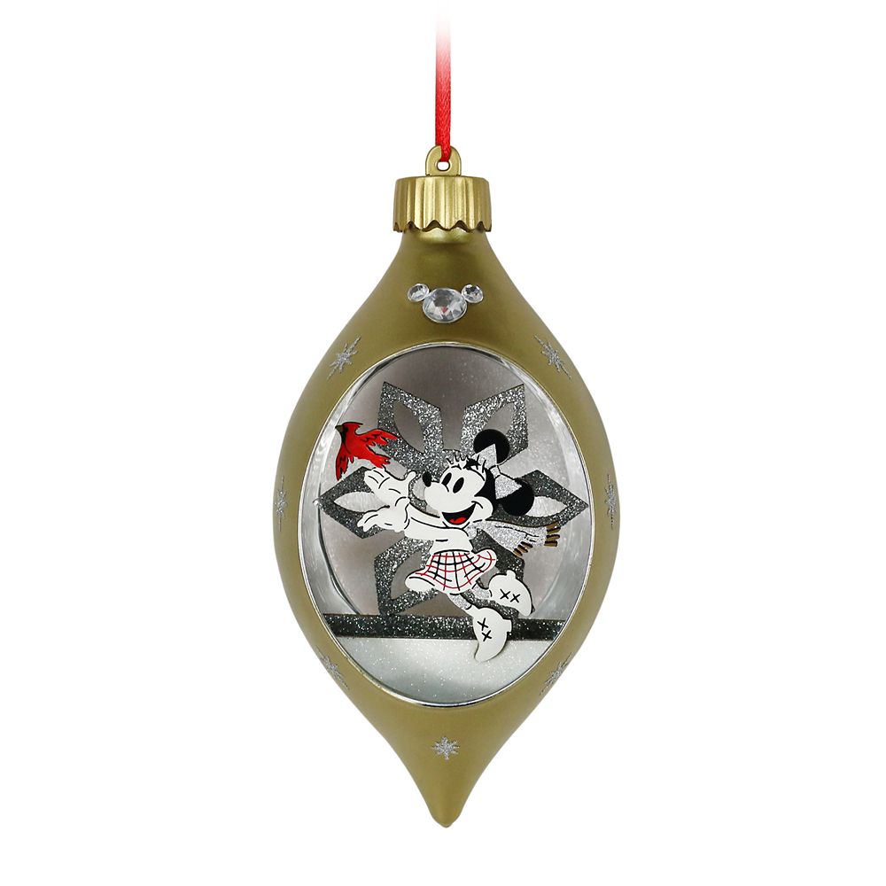 Our frosted glass drop ornament lights-up your life from a clear picture window, illuminating Minnie Mouse and a glittering snowflake. Stardust and faceted gem accents add an extra touch of elegance to this heirloom treasure.