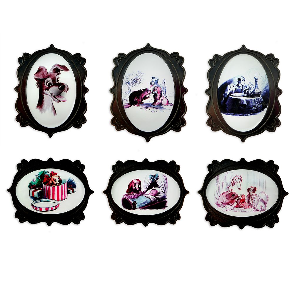 - Pins feature 1) Lady as puppy, 2) Tramp portrait, 3) Lady and Tramp at dinner, 4) Lady and Tramp with beaver, 5) Lady with Peg, Bull, Boris, and Toughy, 6) Lady with baby