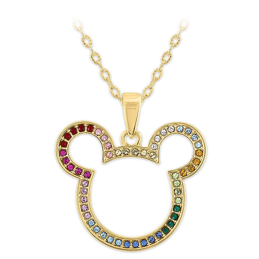 Mythically gold is found at the end of the rainbow, but with this Mickey Mouse necklace, a rainbow is found at the end of the gold chain. The Mickey icon pendant is outlined in multicolored handset, genuine Swarovski crystals.