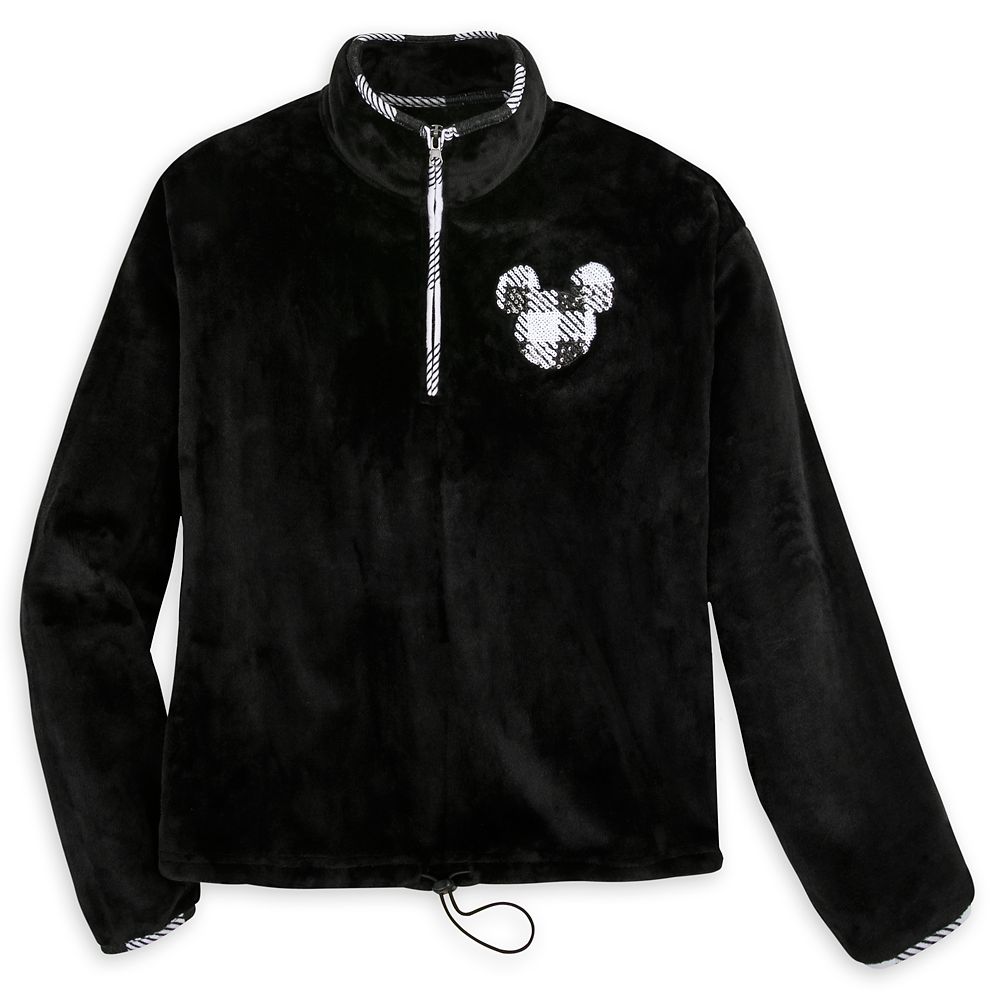 Enjoy the laid-back luxe lifestyle in this velvet pullover top featuring a black and white plaid sequin Mickey icon on the chest. The high collar with one-quarter zip closure will keep you cozy, while black and white plaid trim and a drawstring hem enhance your look.