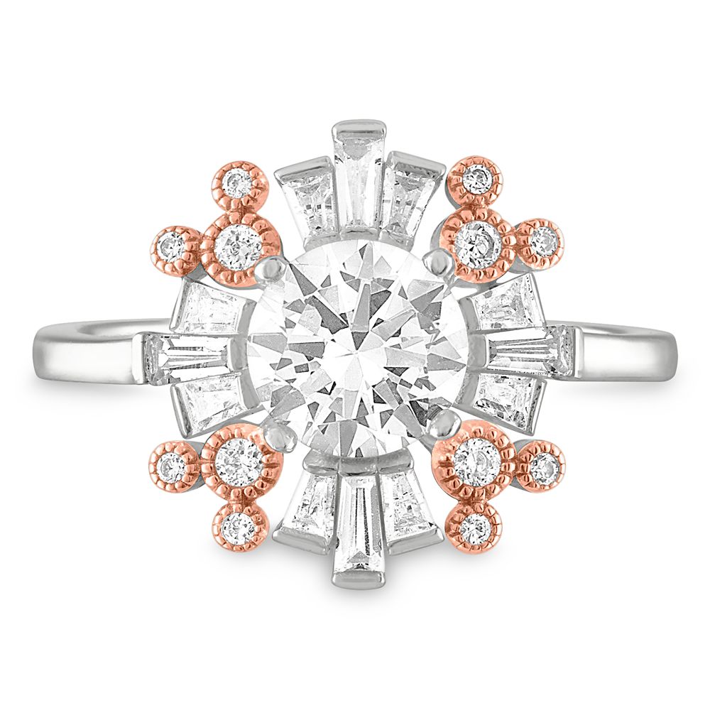 Dazzling clear cubic zirconia stones make up the tiny Mickey Mouse icons and faceted deco design of this elegant sterling silver ring by Rebecca Hook. A rose gold finish sets off the striking stone configuration.