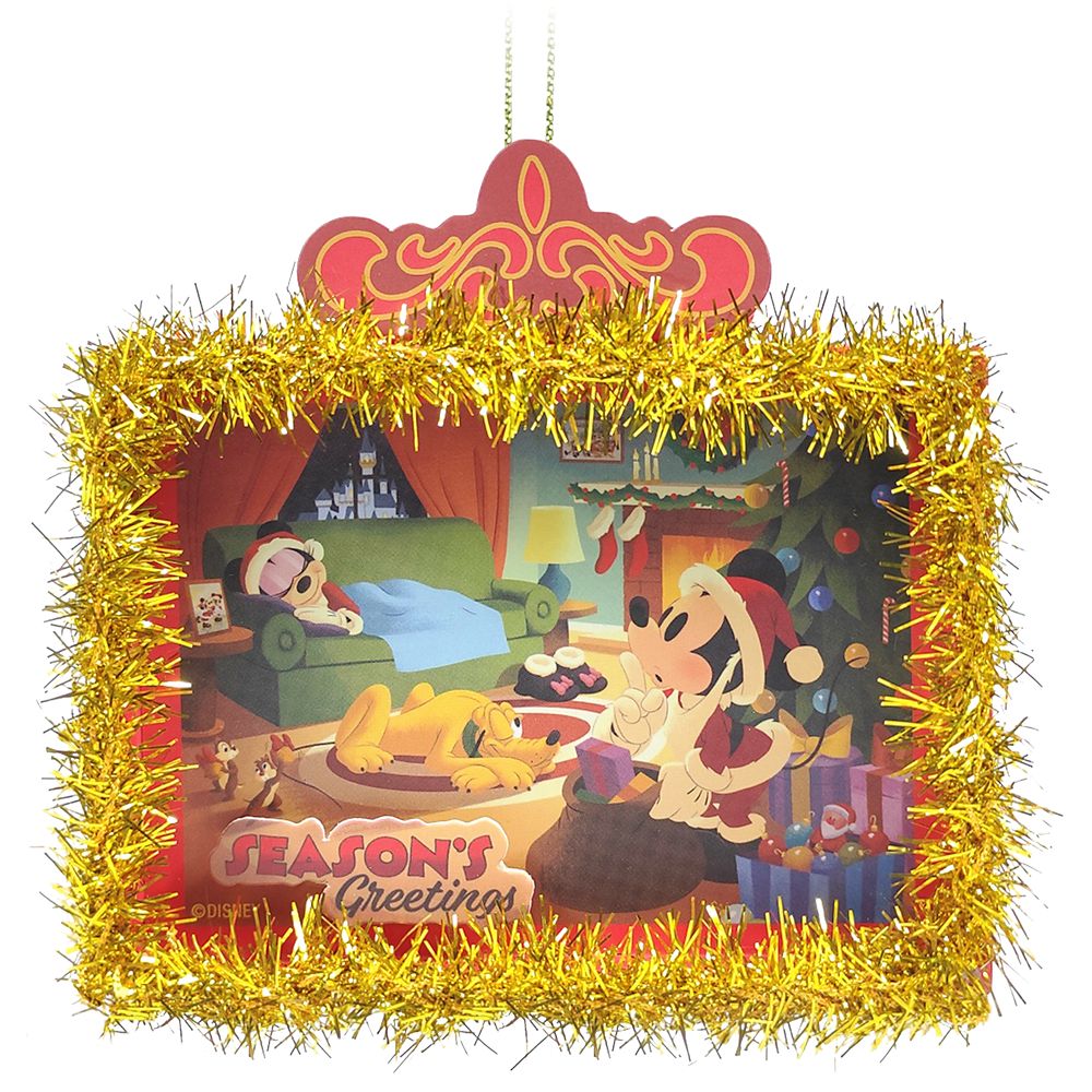 This nostalgic paper ornament features a printed scene on each side with Santa Mickey and the gang wishing all ”Season’s Greetings” and ”Holiday Cheer.” Trimmed with tinsel, it will take you back to the golden age of celebration.