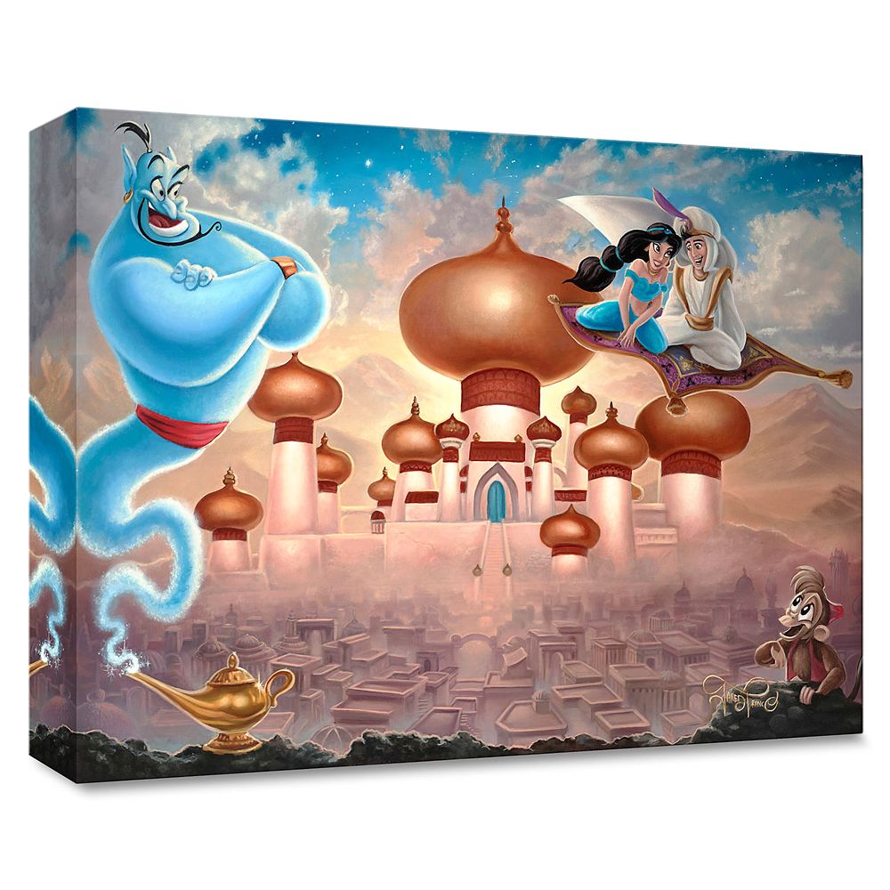 Jasmine and Aladdin take a romantic magic carpet ride high over Agrabah while Genie and Abu look on in this giclée on canvas by Jared Franco. The limited edition ”A Whole New World” comes gallery wrapped and includes a certificate of authenticity.