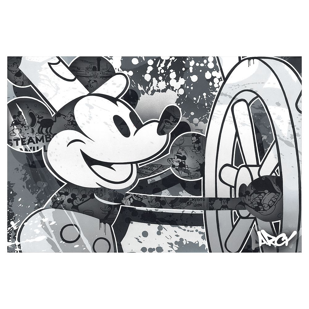 Renowned artist ARCY blends his contemporary splashed street art style with a nostalgic montage inspired by Mickey Mouse’s 1928 movie debut. Our limited edition ”Steamboat Willie” print on canvas comes gallery wrapped and includes a certificate of authenticity.