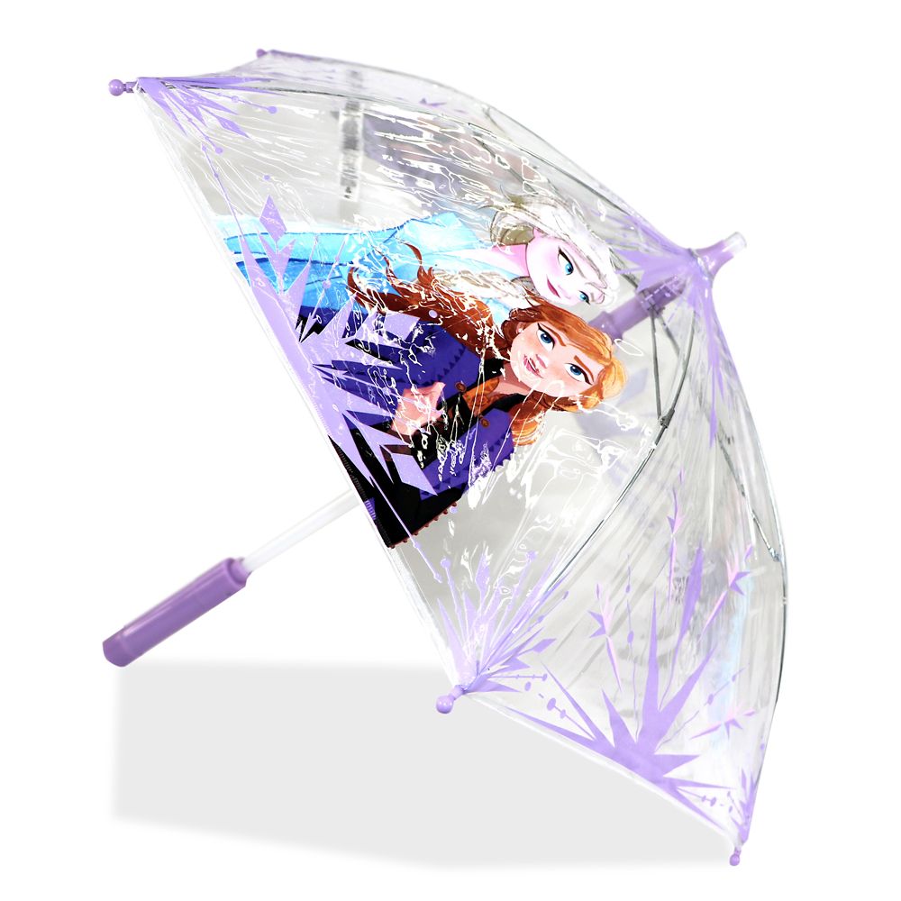 Battle the elements in magical style with this clear umbrella featuring Elsa and Anna from Frozen 2. The translucent dome also features snowflake screen art, and the light-up shaft glows white, pink and purple, perfect for exploring enchanted forests.