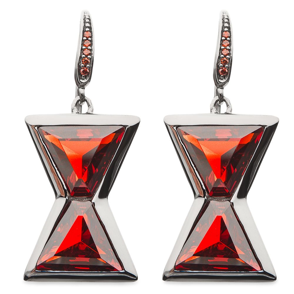 Vibrant custom cut blood-red crystals create a sleek and subtle homage to the iconic Black Widow Hourglass. Framed in sterling silver and plated in polished black ruthenium, the distinctive insignia hangs from RockLove’s signature sterling silver French wires featuring matching red pavé crystals.
