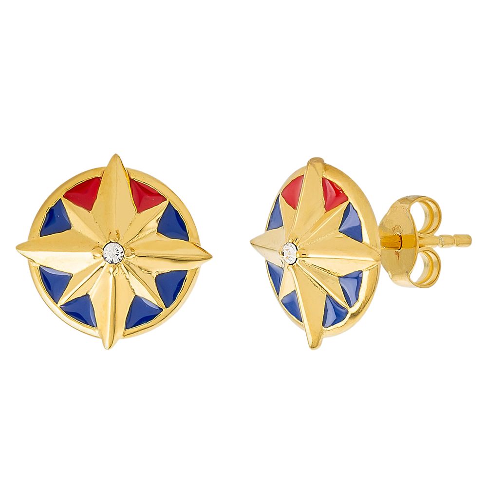 A tribute to fighter pilot Carol Danvers, her Kree powers and iconic Hala Star, these post-back earrings are crafted in sterling silver and plated with yellow gold. The faceted white crystals and premium red and blue enamel make these petite and lightweight earrings a powerful addition to your look.