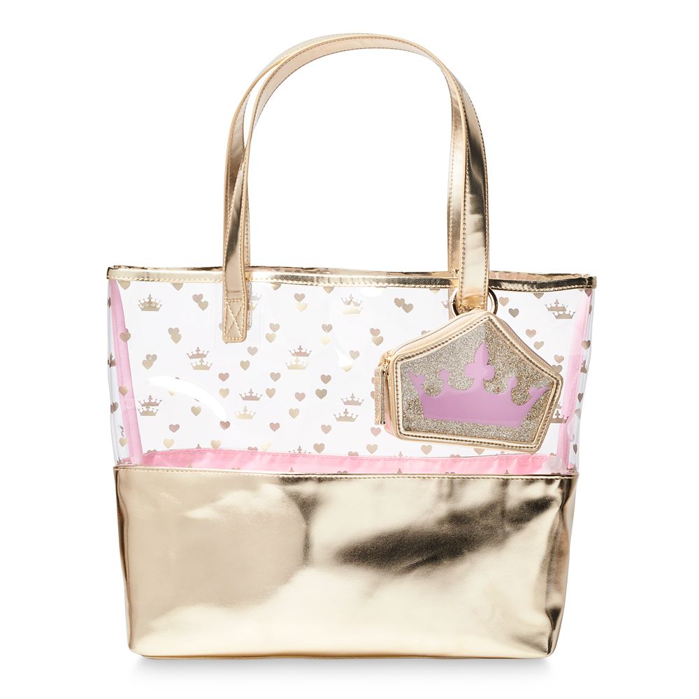 All hail the princess carrying this chic swim bag with clear top section and faux leather gold base and shoulder straps. A removable zippered coin purse with pink crown and gold glitter is perfect for storing small royal essentials.