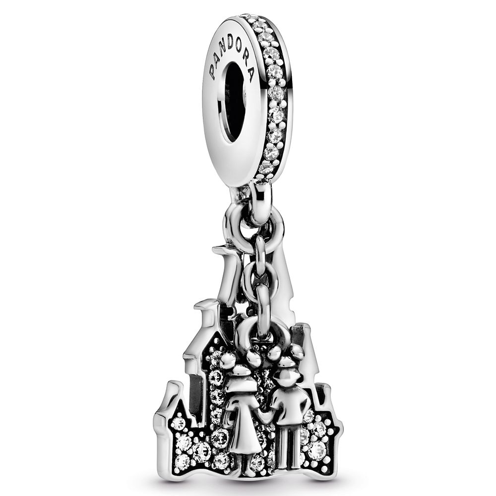 Celebrate forever with this sterling silver dangle charm by Pandora Jewelry sculpted into a Fantasyland Castle facade with a couple at the doors. Glittering crystals accent the castle and charm ring, while the back is simply engraved with ”forever.”