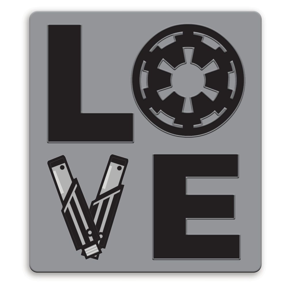 ”LOVE” receives a sinister Star Wars makeover on this limited release pin by Her Universe featuring the Imperial Crest and a pair of lightsabers.