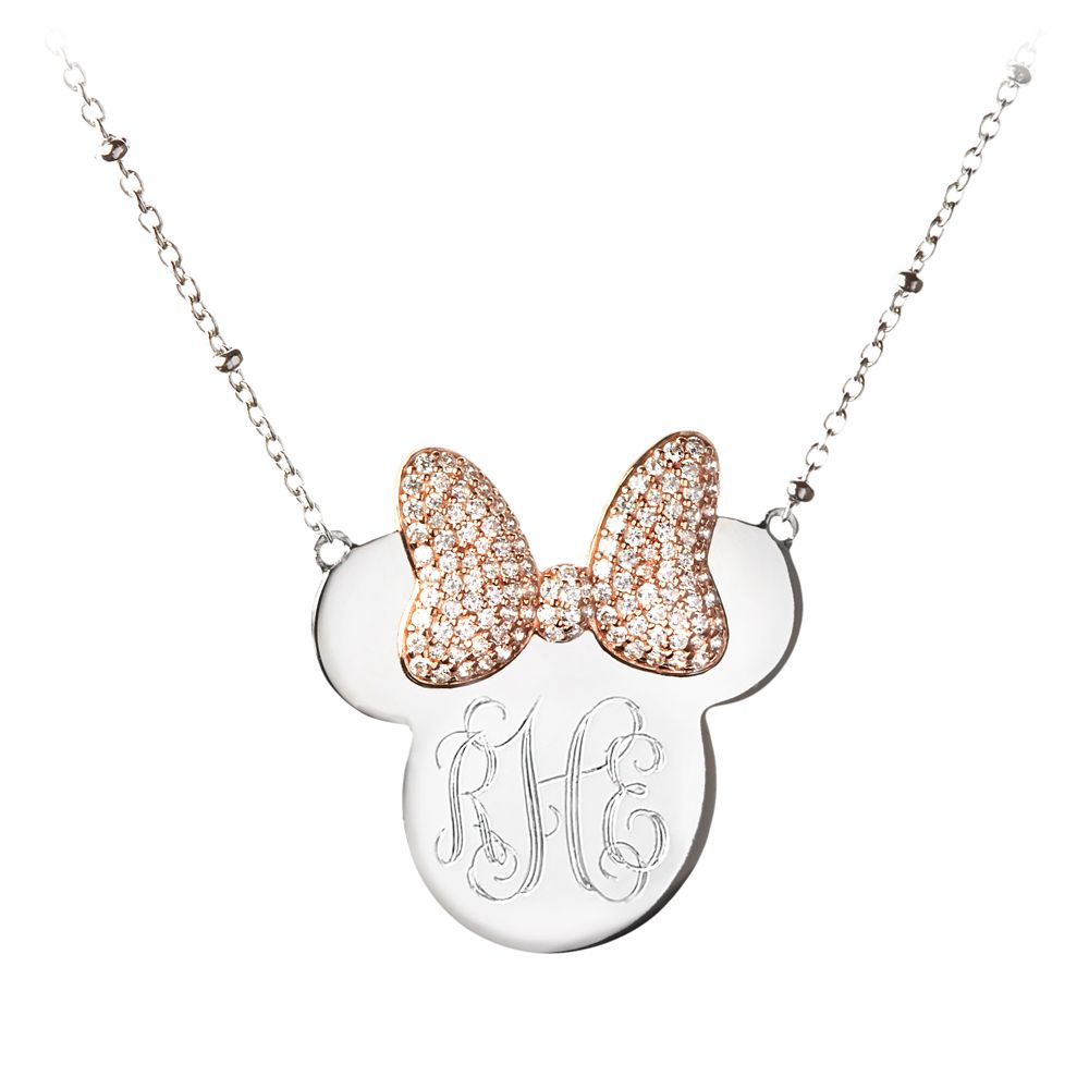 This sterling silver necklace by Rebecca Hook in the form of a Minnie Mouse icon is topped by a jeweled bow and can be personalized with an engraved monogram.