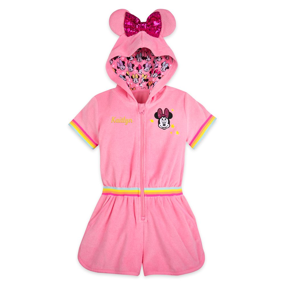 After a swim, Minnie Mouse helps keep you cozy with her bright pink cover-up. This soft terrycloth robe with mouse ear hood and zip front features rainbow trim, puff sleeves, and a pretty Minnie appliqué.