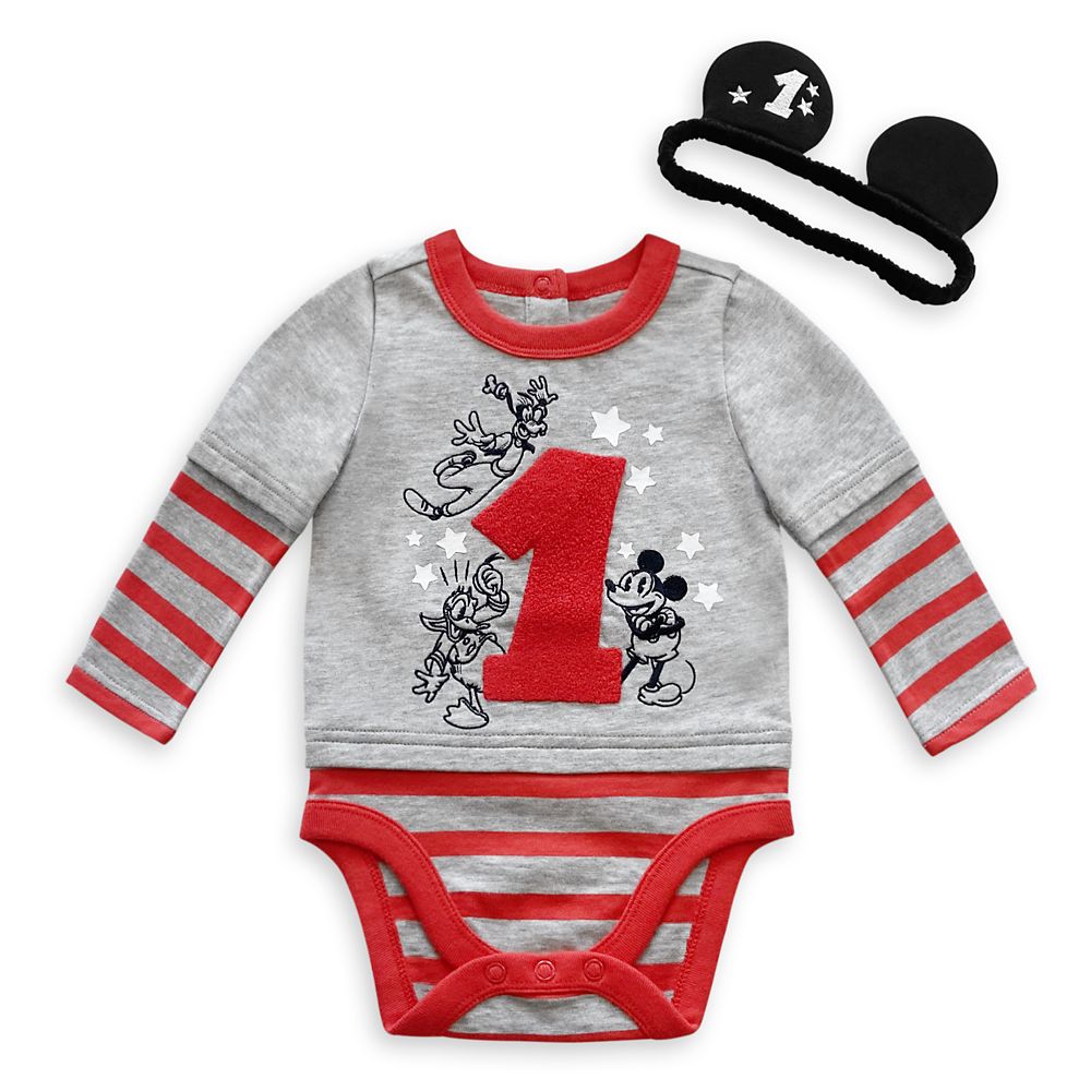 Mickey, Donald, and Goofy join in the celebrations with this 1st Birthday Bodysuit Set. The anniversary outfit includes a layered jersey knit bodysuit and an elastic ear headband, both featuring embroidered designs with the landmark number!