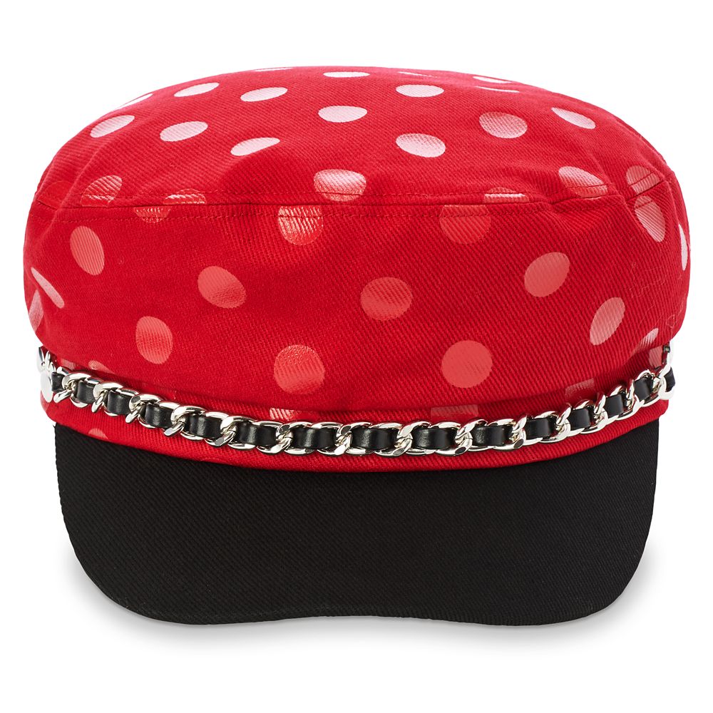Our Minnie Mouse pageboy cap is a sweet and stylish way to top off any outfit. With red-on-red polka dots, a black brim and a chain with woven faux leather, it’s equal parts edgy and adorable.