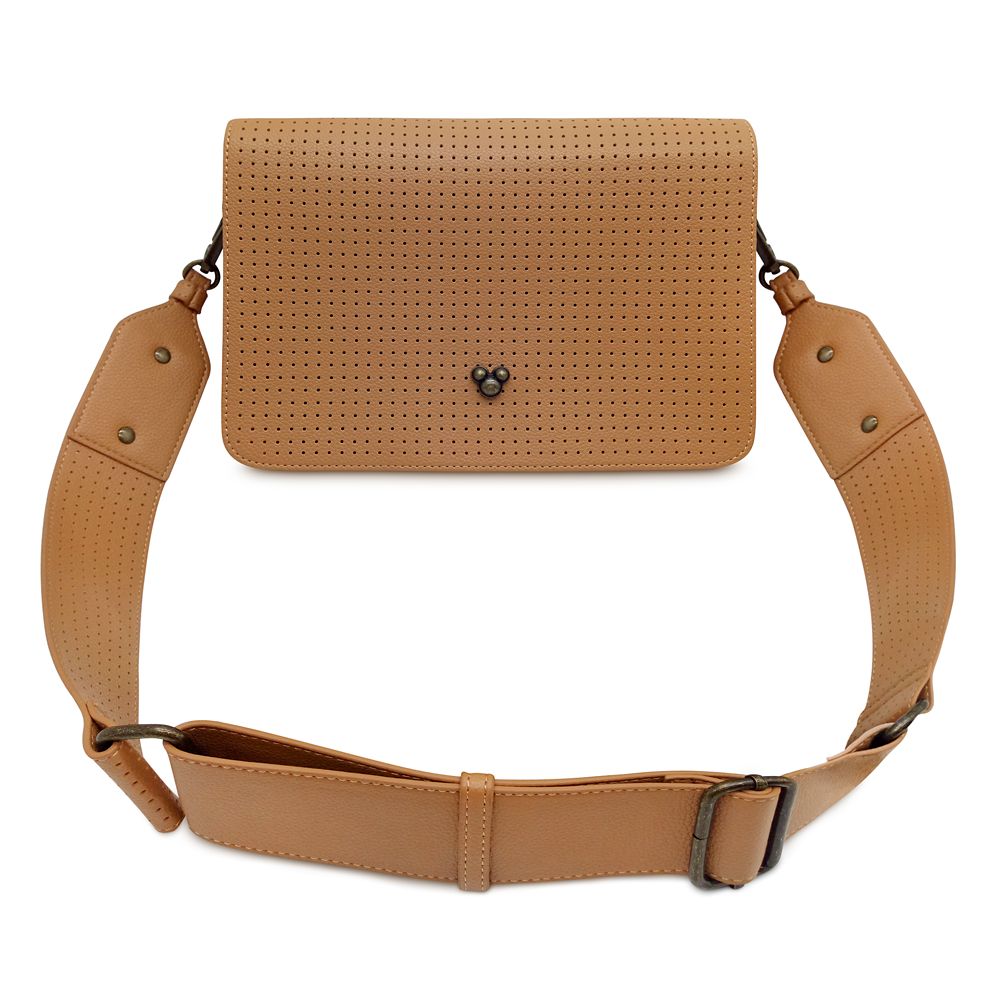 Mickey delivers the good with this messenger style crossbody bag. A metal mouse icon accents a simulated leather case, perforated to display the pins and charms (sold separately) that express your personal flair.