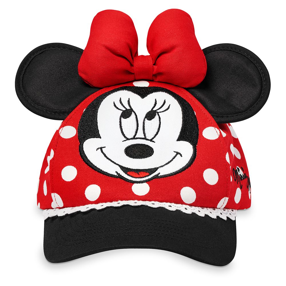 They’ll take a swing around the park sporting Minnie’s polka dot baseball cap topped by ears and a bow, complete with embroidered Minnie ”signature” and Disney Parks logo.
