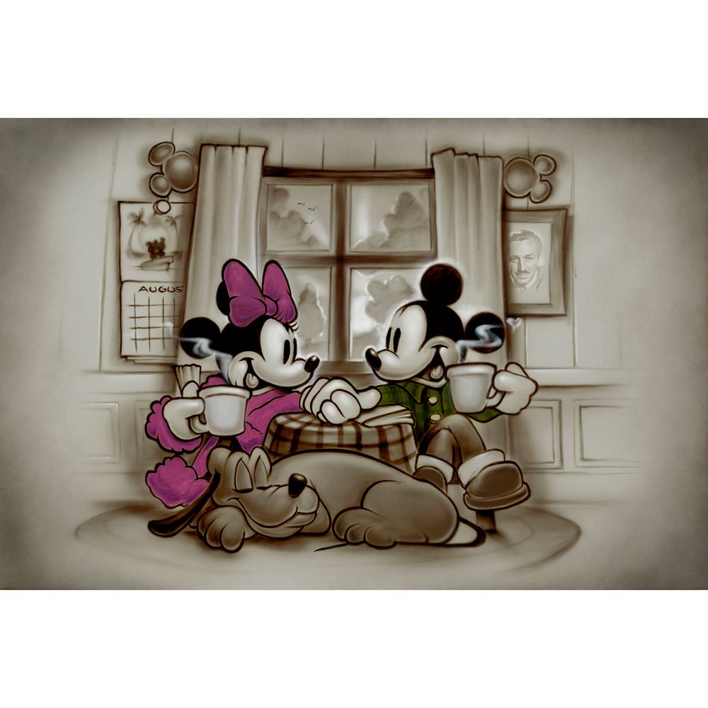 With Pluto curled up at their feet, Mickey and Minnie share a tender moment of domestic bliss with a nice hot drink, while Walt looks down on the happy couple from his picture on the wall. Created by renowned artist Noah, ”Home is Where Life Makes Up Its Mind” comes in a variety of sizes and formats to grace any home.