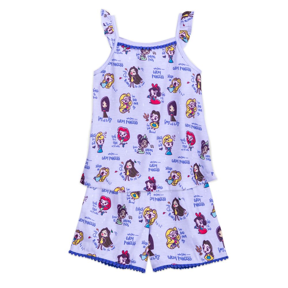 Every princess sleeps in, feels like a fish out of water, sings to the birds, and looks adorable in this shorts and tank sleep set. Each cute little Kawaii-style Disney Princess gets her own call out on these pom pom-trimmed PJs.