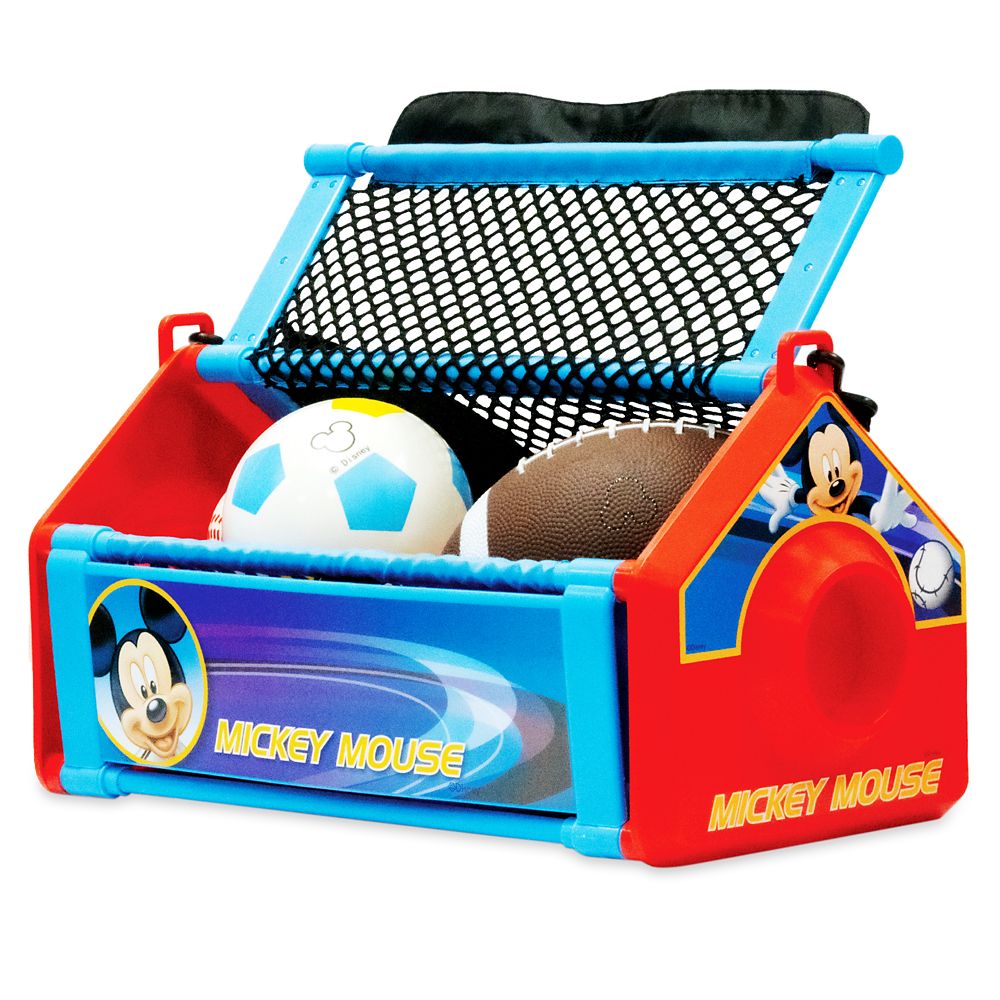 Calling all sports fans! Mickey Mouse wants to team up with you for an array of swell games. This handy case holds a mini soccer ball, football, baseball bat and baseball, plus all the pieces you need to set up a soccer goal, football goalpost with kicking tee and baseball tee.