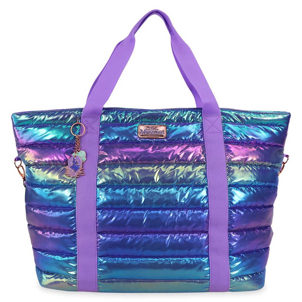 Carry treasures untold in this iridescent quilted fashion tote inspired by Ariel and Disney’s The Little Mermaid. A detachable shoulder strap and pair of cloisonné charms make it fit for your inner princess. Answer the siren’s call.