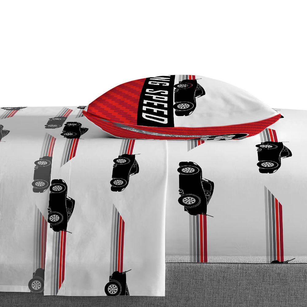 Race off to sweet dreams with this Cars bedding set that comes in twin and full sizes. Lightning McQueen zooms across the top of the comforter, which is backed with a solid vibrant red, the sham features ”95,” and a bold black, red and gray design inspired by the Piston Cup winner covers the flat and fitted sheets.
