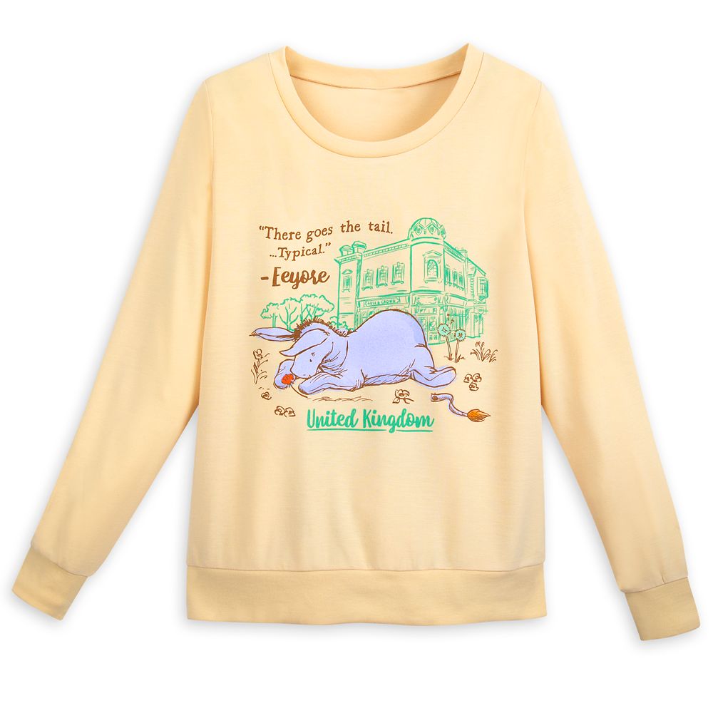 ”Typical.” When on vacation from the Hundred Acre Wood, Eeyore loses his tail again. Join him on the journey in this long sleeve tee with scoop neckline, a classic souvenir of the United Kingdom Pavilion at Epcot’s World Showcase.