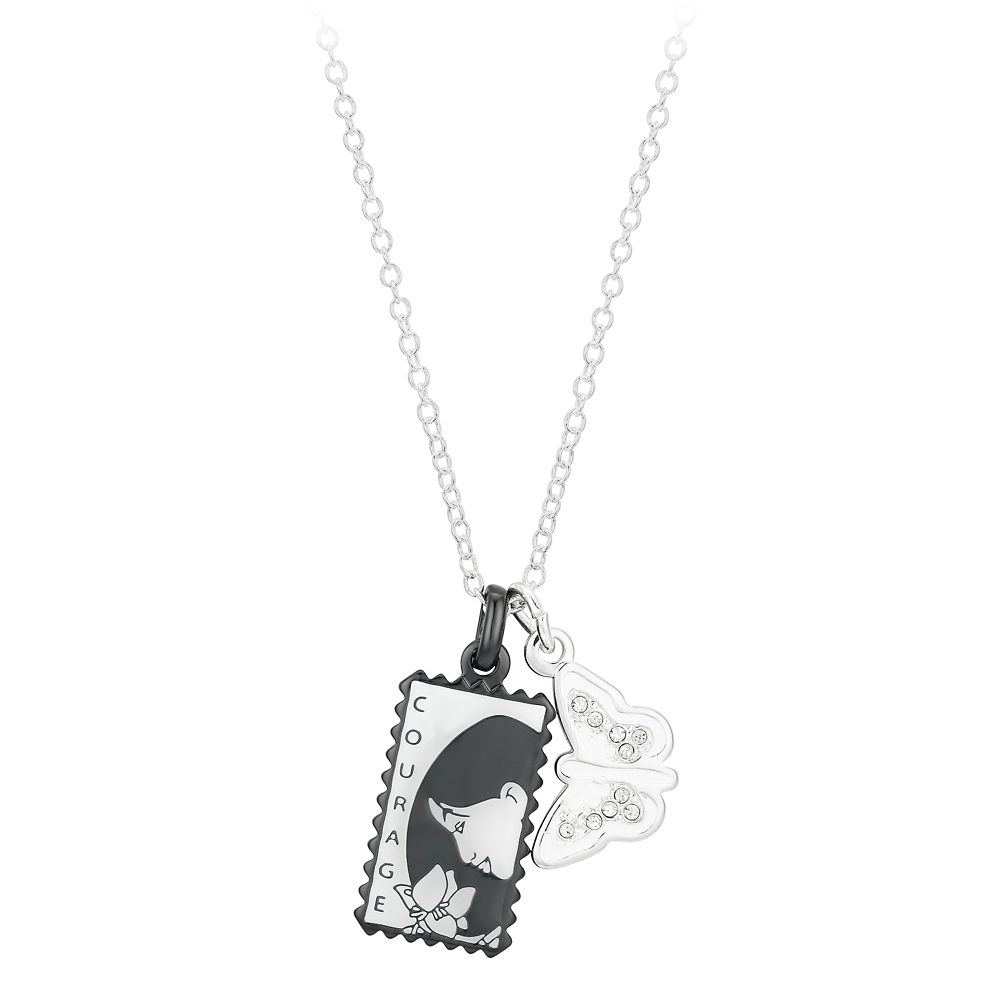 Take ”Courage” from this Mulan necklace featuring the warrior princess. Inspired by Disney’s 1998 animated movie, the black rhodium pendant includes a serrated edge, while the contrasting beautiful white enamel butterfly pendant sparkles with clear gems.