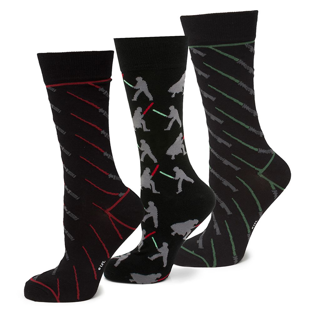 Take a walk on the dark side with this set of Star Wars socks inspired by the epic Lightsaber duel between Darth Vader and Luke Skywalker. The three pairs of socks each have a different design featuring the red and green glow from their weapons standing out against the black background.