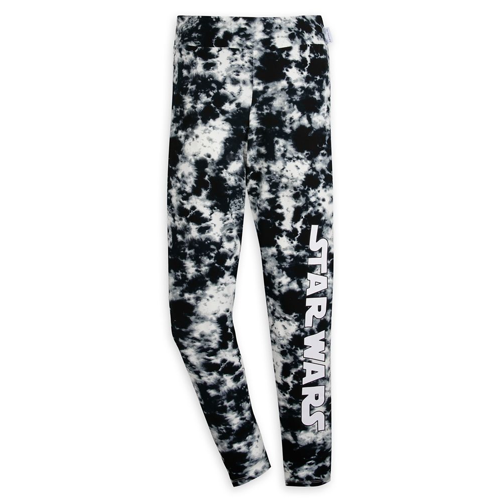 The Star Wars logo and Millennium Falcon icons are spotlighted amid a ”cloud wash” tie-dye print pattern on these stretch leggings from a galaxy far, far away.