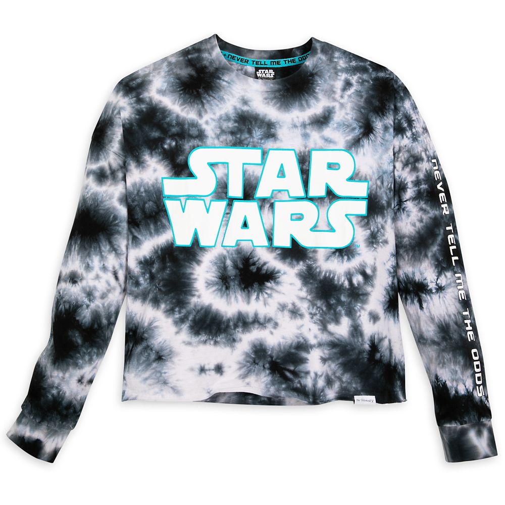 Aspiring Snowtroopers aren’t the only ones who’ll admire the Star Wars logo against a ”cloud wash” tie-dye pattern on this long sleeve pullover with semi-cropped hem and ”Never tell me the odds” text on sleeve.