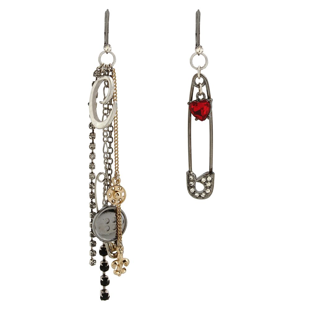 Betsey Johnson brings her distinctive style to these daring dangle earrings inspired by the live action film, Cruella. The pair features two different designs topped with a clear crystal accent and secure lever backs—one has clear-gem-studded safety pin and red heart charms, while the other has link chains, vertical gem. dangles, a ”C” charm and more.