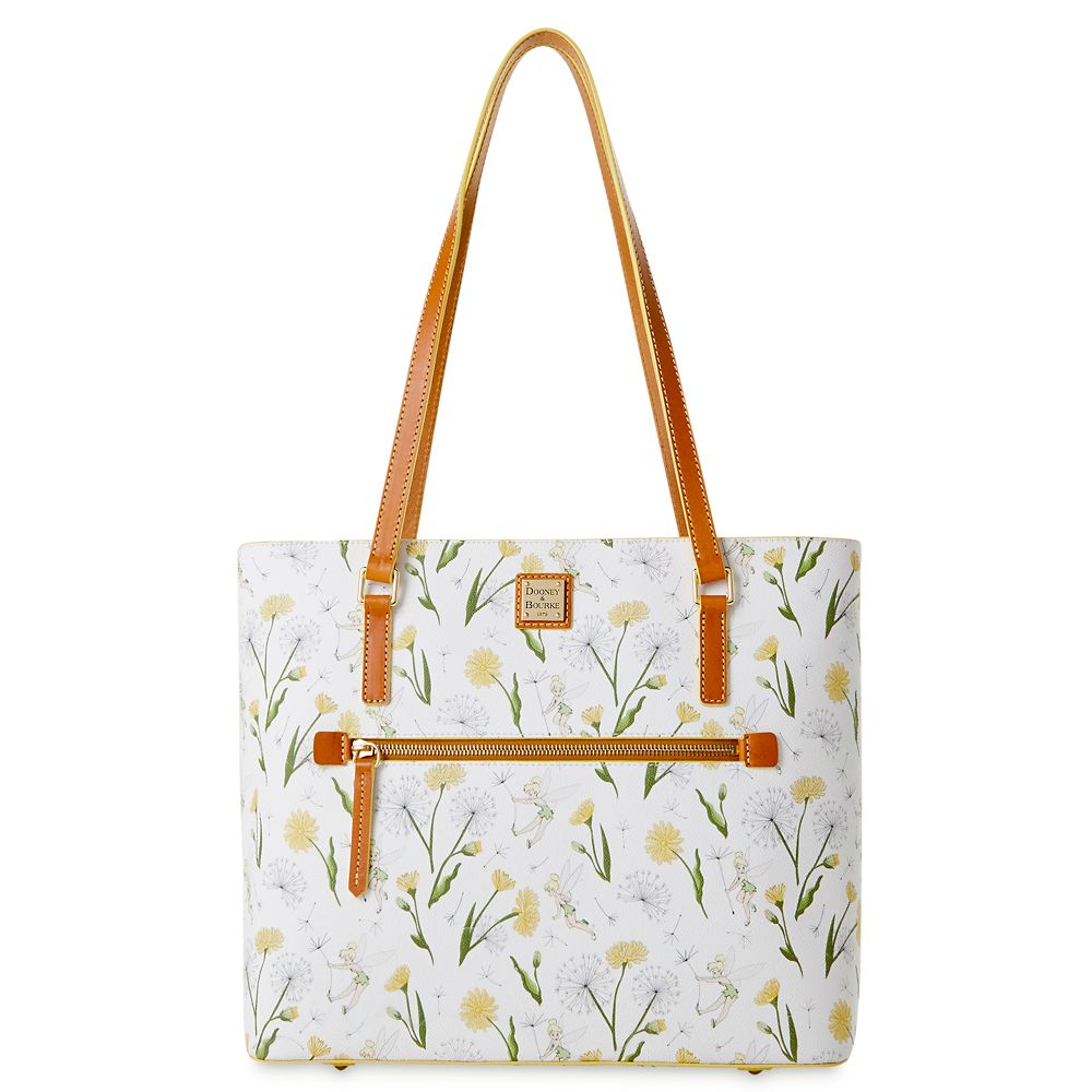 This roomy shopper tote by Dooney & Bourke is pixie perfect! With an allover pattern of Tinker Bell fluttering among flowers, the coated cotton exterior in subtle springtime tones will add a refreshing accent to any outfit.