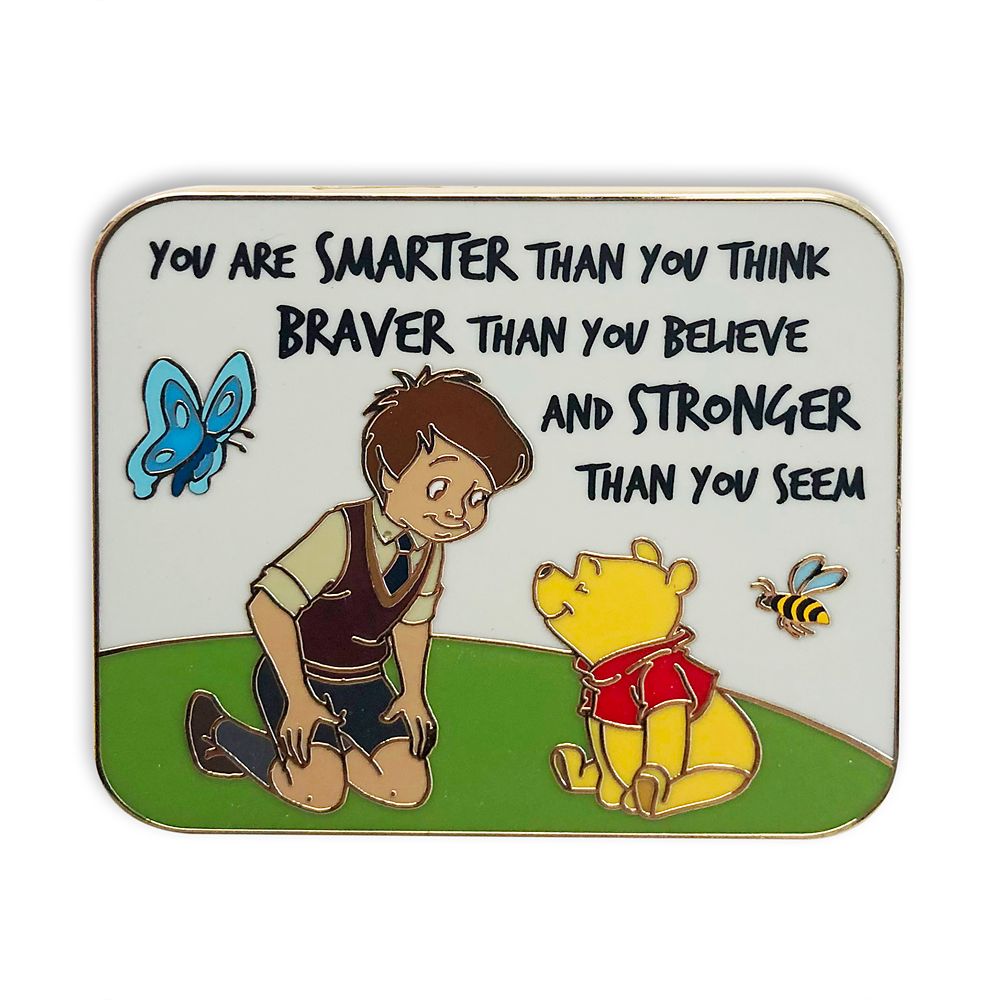 Christopher Robin encourages Winnie the Pooh to always remember, ”You are smarter than you think, braver than you believe, and stronger than you seem,” on this wistful pin providing a note of reassurance for pin collectors.