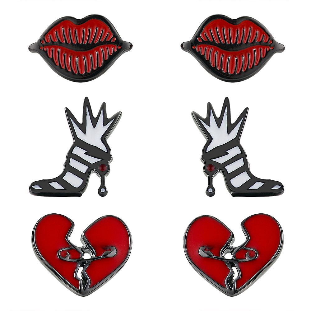 Inspired by the fiercely fashionable live action film Cruella, this set of three stud earrings offer a perfect pair for any occasion. Featuring enamel accents, red crystal details and black rhodium tone, this post back earring set includes red lips, white high heel boots and broken red hearts with safety pin.