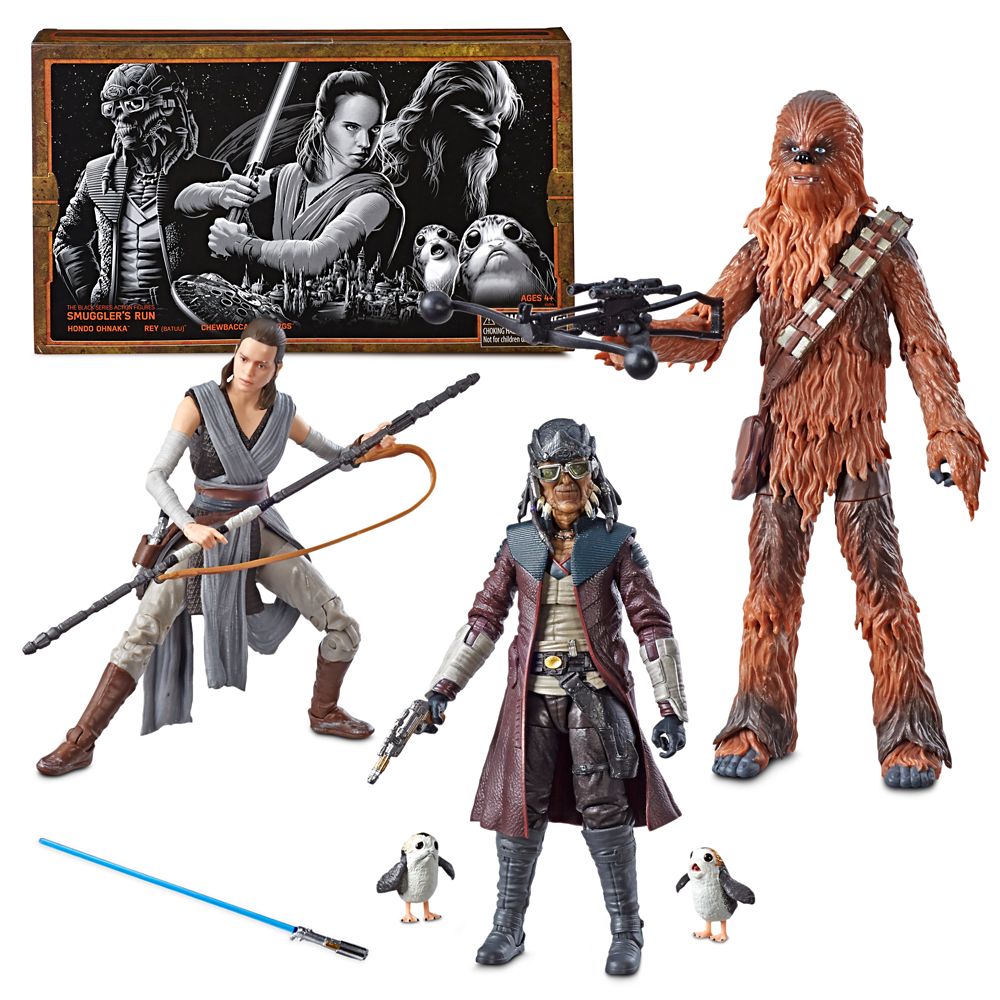Four colorful and contrasting characters from Star Wars universe are brought together in this exclusive Smuggler’s Run figure set featuring Rey (Jakku), Chewbacca, Hondo Ohnaka, and Porg figures.