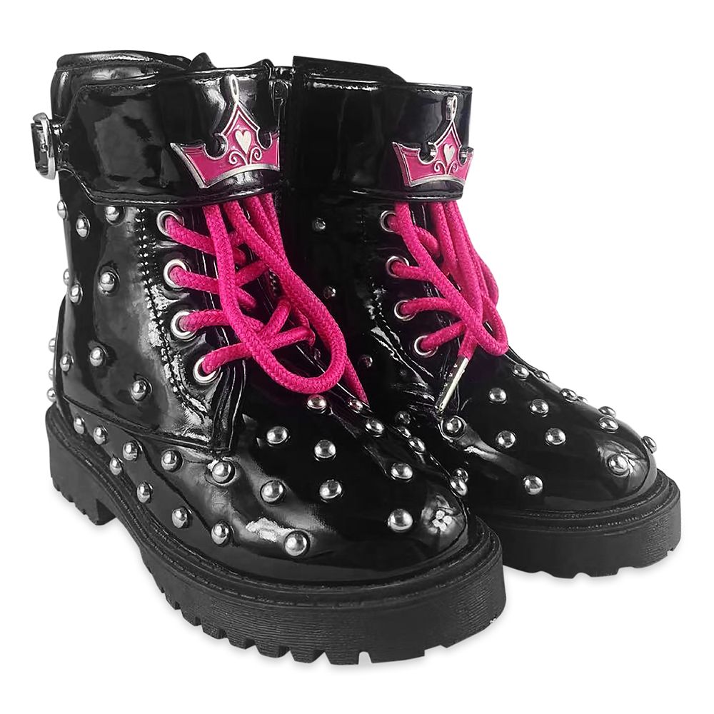 They’ll forge their own royal path with these stylish boots. The black uppers are accented with silver metal studs, while the decorative top strap features a metal crown accents with pink details adding a regal touch to these chunky-soled shoes.